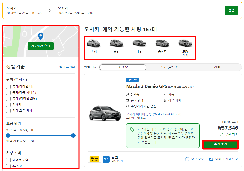 자동차를 인수받을 위치를 확인하며 렌트카 업체를 선정해줍니다.